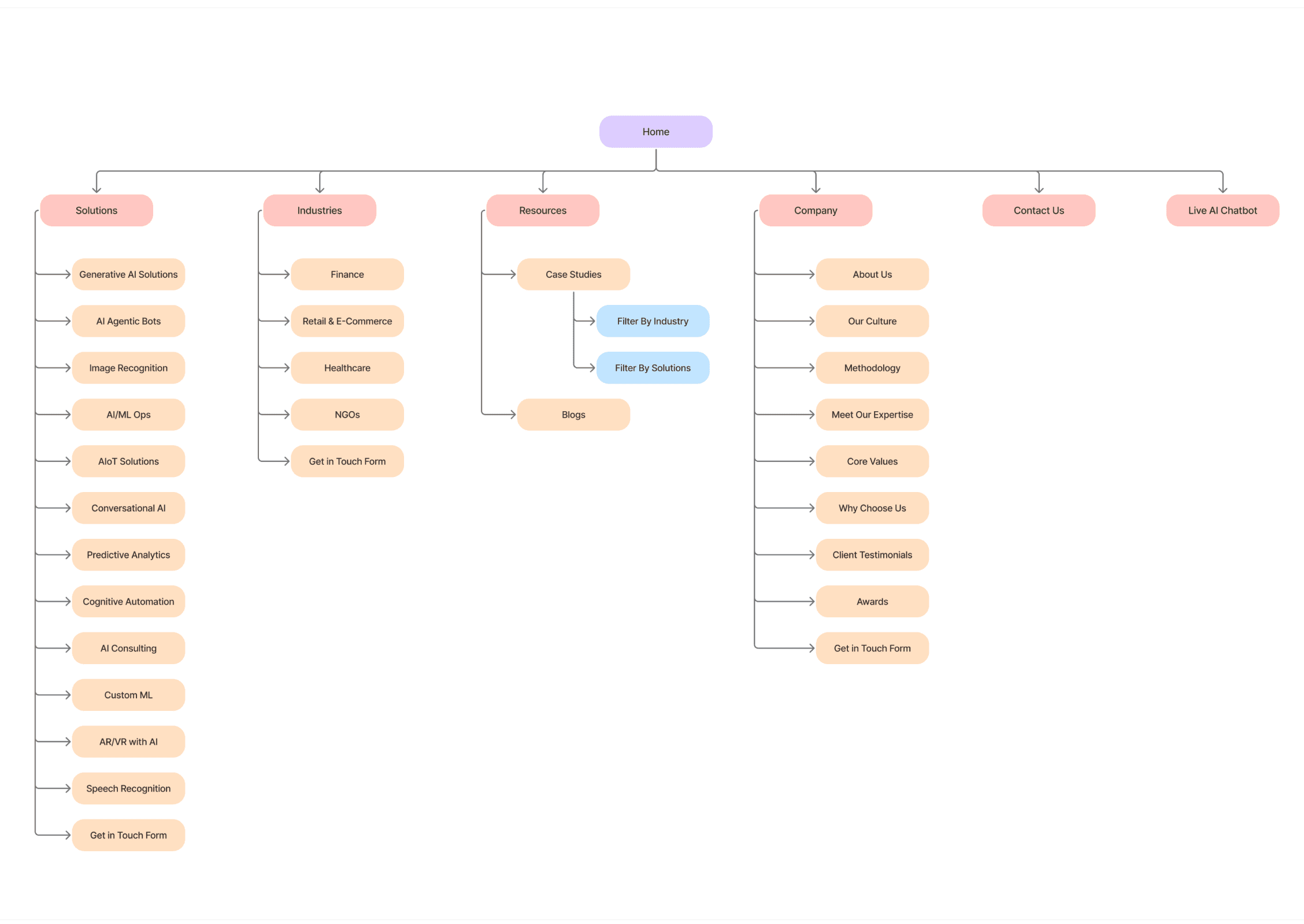 The sitemap established a clear structure and hierarchy, guiding users from high-level AI offerings to detailed solutions and case studies through a logical, intuitive flow.